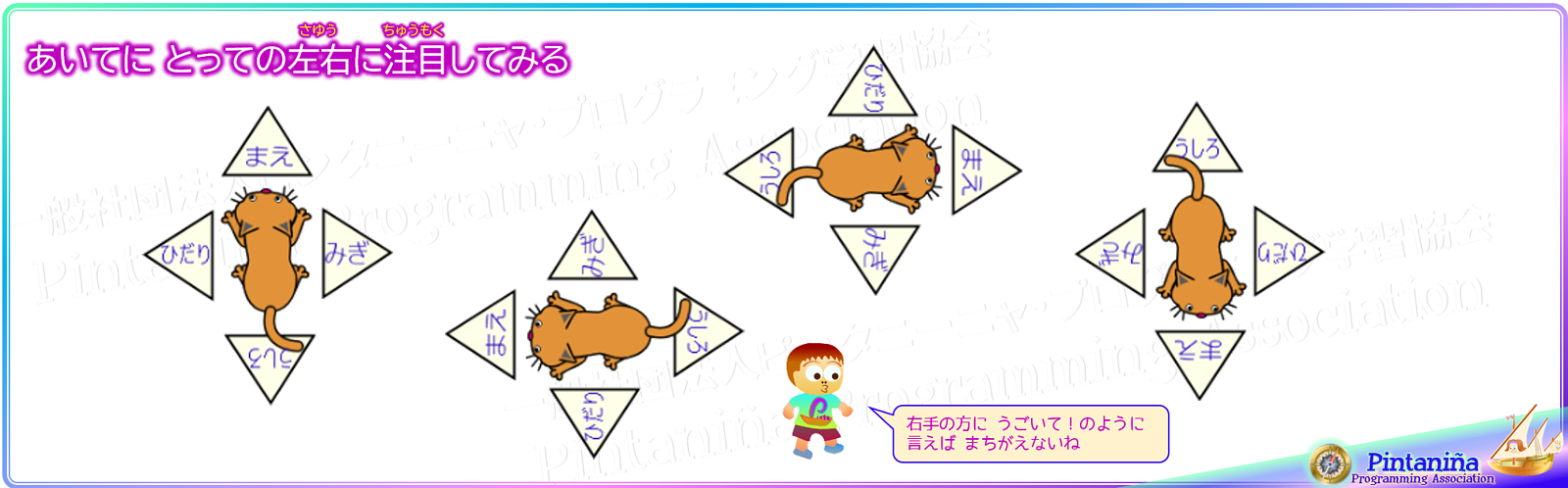 向かい合った先生に向けて、『先生、右むいて』などと言ってみましょう。左の方に顔を向けたと思います。