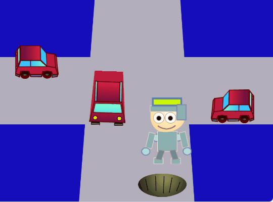 左の図のロボえもん君、かなりマズい所にいますね。右側に逃げれば安全そうですが、『右に よけて!』と言ったらどうでしょうか?ロボえもんは我々から見て左側に動いてしまい、車とぶつかってしまいそうです、あぶない!