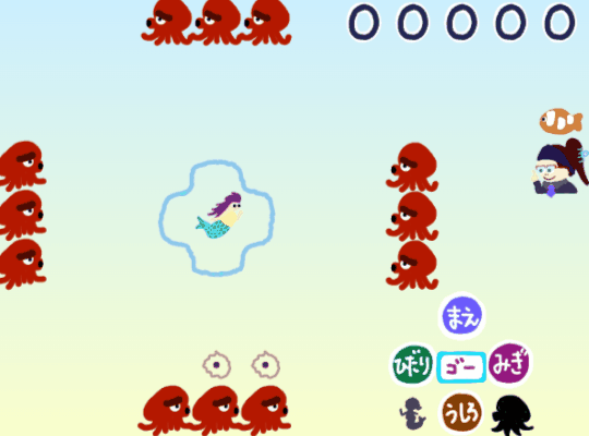 まずは、相手にとっての向きを指示するプログラムです。飛んでくるタコのスミをよける指示を出そう。