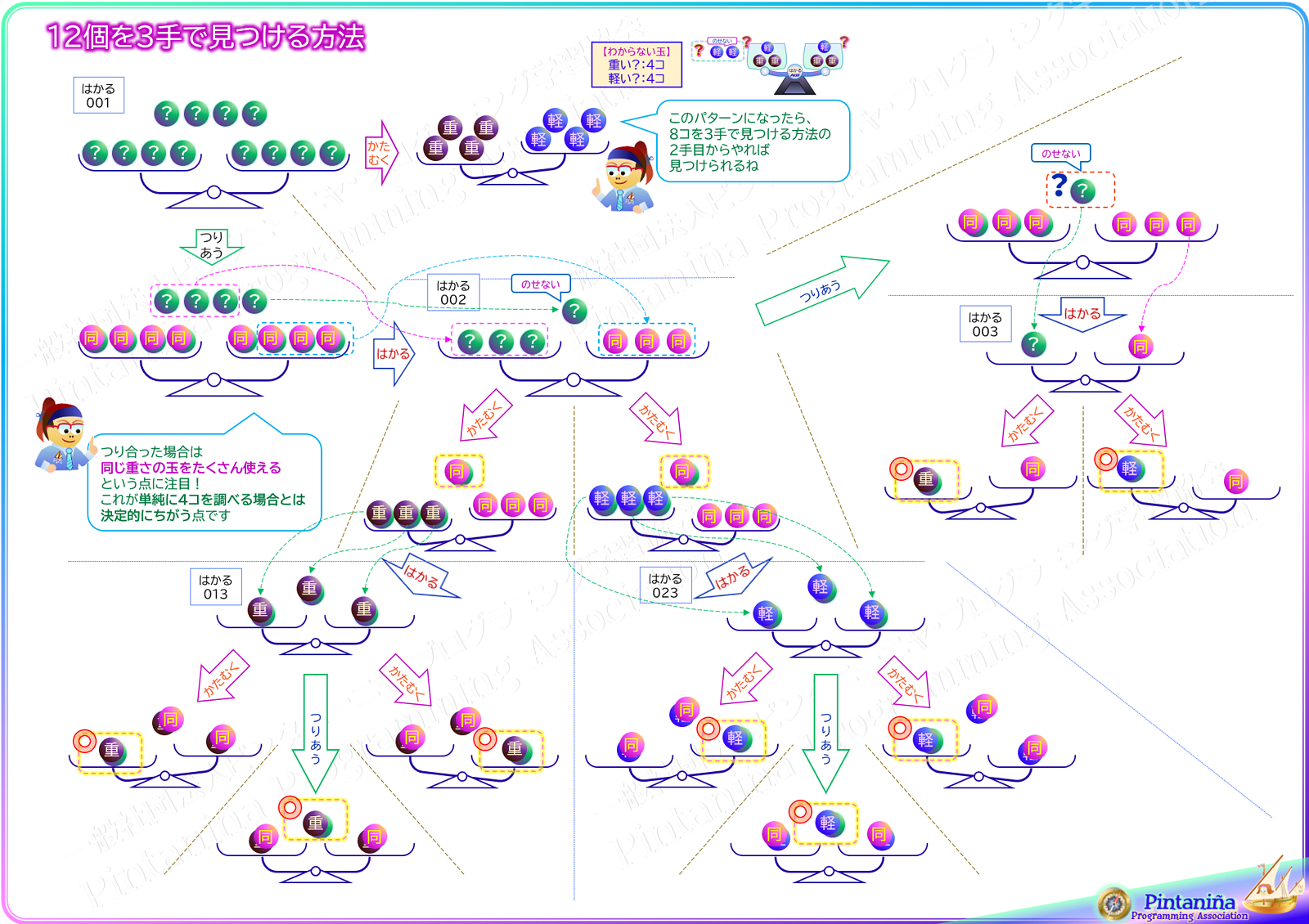 12コの玉を3手で見つける方法です。(ア)とか(イ)とかで説明すると大変なのですが、この図のように『はかって重たい方の玉』など、はかった結果が分かれば解ける方法です。