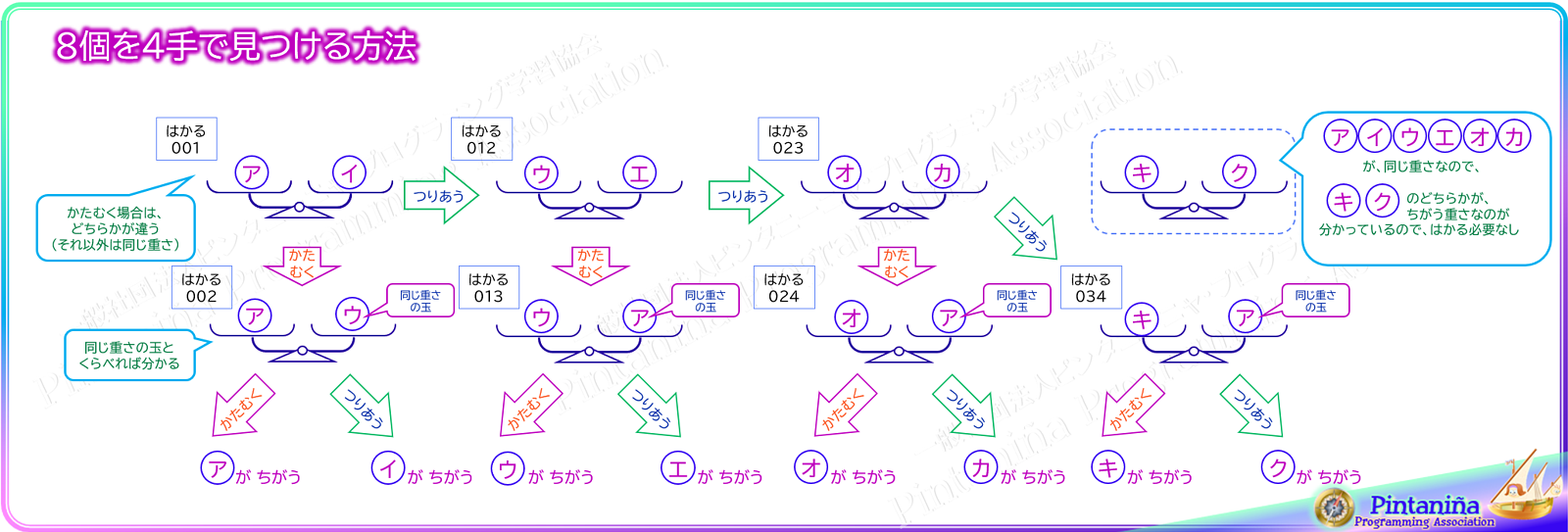 8つの玉から見つけるのがタイヘンなら、玉の数を少なくすればいいでしょう。