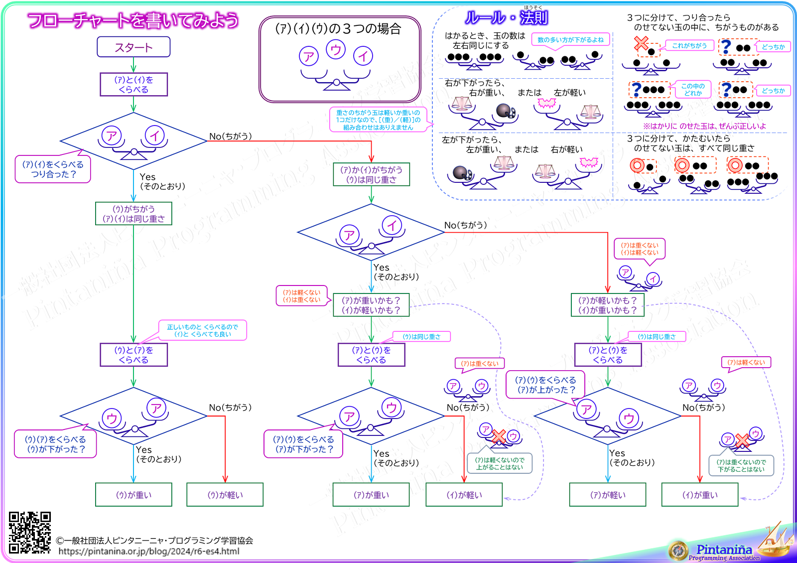 これが基本です。これを応用すれば、いろいろ対応できます。たとえば全部で6コ場合、上記(ア)(イ)(ウ)がそれぞれ2個ずつのグループだとすると、上記方法で重さの違う玉がどのグループにいるかが分かります。その二つの玉の片方を、同じ重さの玉とくらべれば見つけられますね。