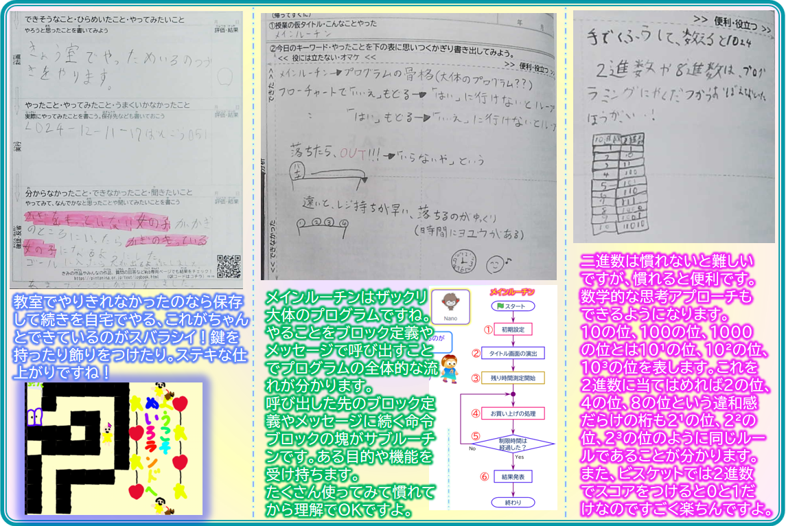 「作りたくなった」は原動力ですね、自分で考えて気になるものを作ってみる。今回紹介した二人の作品はどちらも宿題スコアゲームのクリスマスとソリからインスパイアされて作った?ものです。特にスクラッチで作ったものをビスケットで再現したのは驚きです!スゴイ!!
