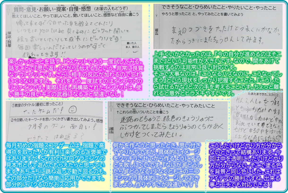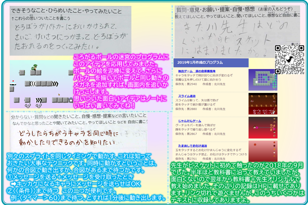 みんながどんなアイデアを出してくれるか、毎週ノートが楽しみです。また、先生への個人的な質問も回答が楽しいです。ビスケットは自由すぎて何が正解なのか最初は良く分からなかったというか、「これで合ってるのか?」とモヤモヤ続きでした。でもやり続けると「これでいいんだ」という納得感が生まれました。お手本がつまらなくなった時が沼への入り口、そこから自分でいろんなプログラムを作るようになりましたよ。