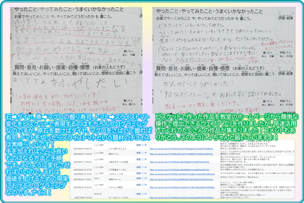 ビスケットは作った作品がビスケットのサーバーに保存されます。完成した作品はその保存場所のURLを発行することができ、そのURLを使えば誰でも遊ぶことができます。ただしリンクURLは複雑な文字の羅列なので、紙にメモするのはほぼ不可能です。そこで、コピーしたURLを手軽に教室のスプレッドシートに追記できるウェブアプリを作りました。早速活用していただけて嬉しいです!