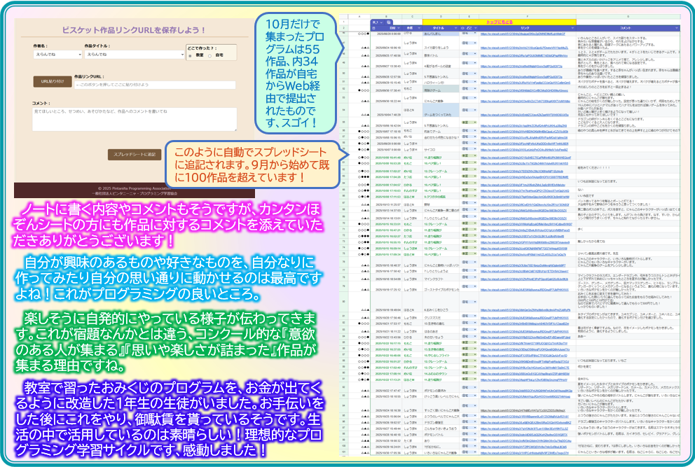 ビスケットは作った作品がビスケットのサーバーに保存されます。完成した作品はその保存場所のURLを発行することができ、そのURLを使えば誰でも遊ぶことができます。ただしリンクURLは複雑な文字の羅列なので、紙にメモするのはほぼ不可能です。そこで、コピーしたURLを手軽に教室のスプレッドシートに追記できるウェブアプリを作りました。早速活用していただけて嬉しいです!