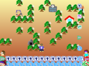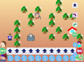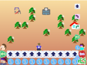 それができたら、動きのカードを並べて目的地に行くプログラムをやりましょう。学校、公園、おうちの3か所にいるニーナちゃん。忘れ物をしたみたいです、何を忘れたのか一緒に探してあげましょう!