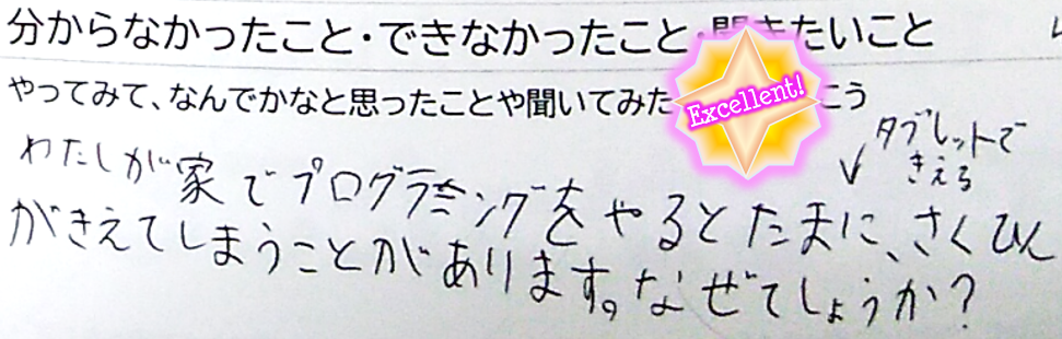 教室でやったときは難しくてできなかったけど、もう一回やってみたら上手にできた!プログラミングって、やり方を覚えるだけじゃ上達しないんですよね。ピアノや水泳のように、やり方を教わったうえで、たくさん練習するから上手になるものです。