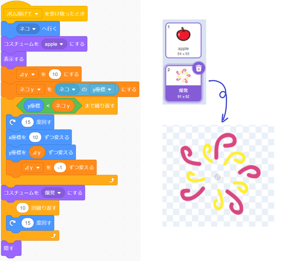 発射のキッカケは別のスプライトに任せてあります。また、コスチュームも色を変えたり、appleの爆発コスチュームをコピーしたりして準備しておきましょう。