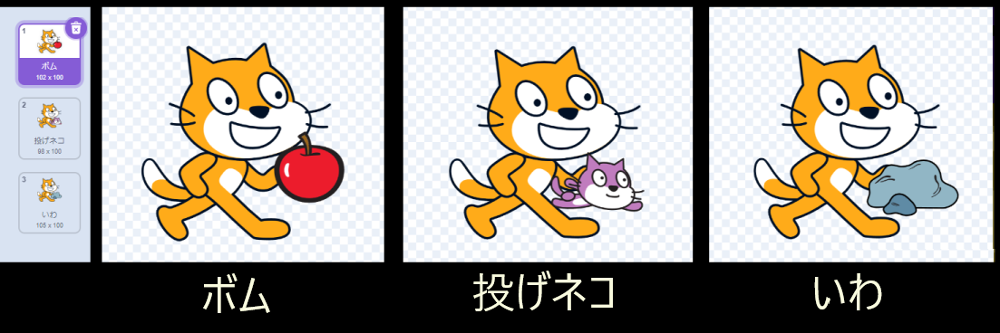 スプライト1はネコに名前を変えておきましょう。また、ネコのコスチュームを下の図のように3種類用意しましょう。別のスプライトからコピーして貼り付けると楽ですよ。コスチューム名も変更しておきましょう。